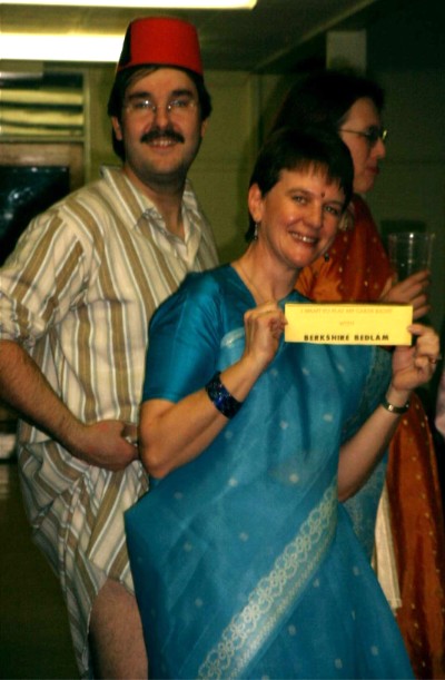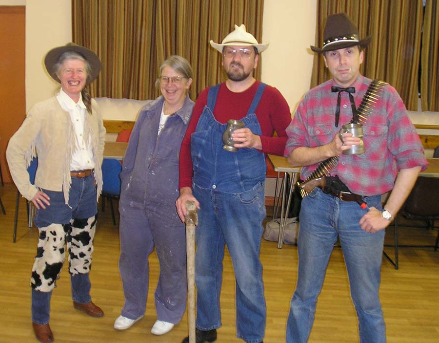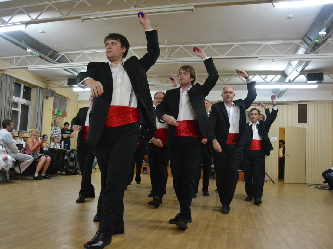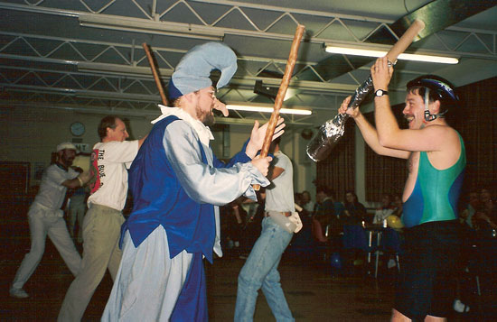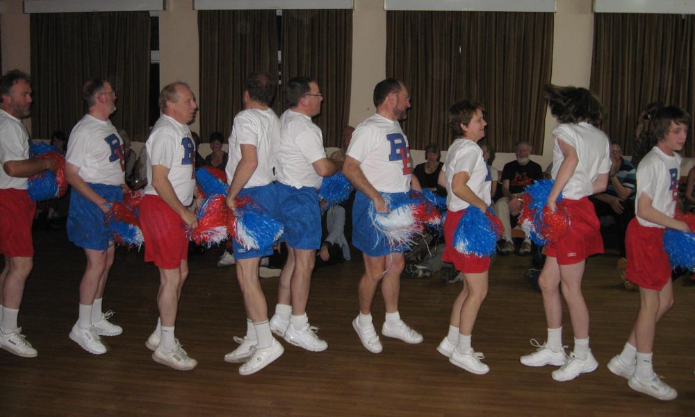 Nowadays the Bunfight is an annual event which is always great fun for everyone attending, young or old – and great to see such a wide range of ages in recent years. It is usually held on a Saturday in late November, traditionally at the California Ratepayers Hall, Finchampstead, (click here for map) with its main feature a ceilidh, always with an excellent band. Each year there is a different overall theme which people are welcome to dress in line with, but this is entirely optional. As well as various other entertainments, BB usually perform a couple of spots during the evening, the second of which is a showpiece non-Morris spot that has nothing to do with the evening’s theme and everything to do with the most bizarre idea they have come up with since the last bizarre idea. The challenge is always to get down to the standard of previous years and amazingly they often succeed.