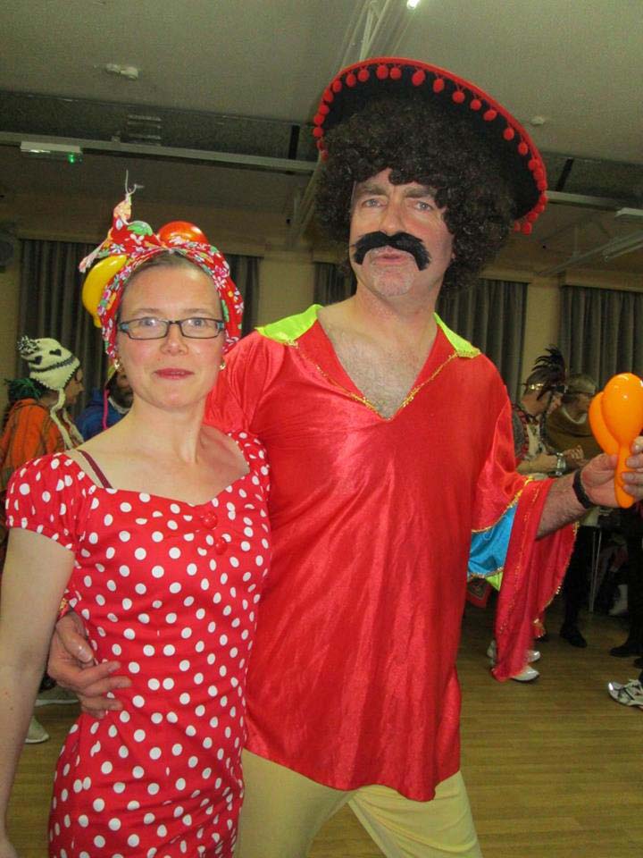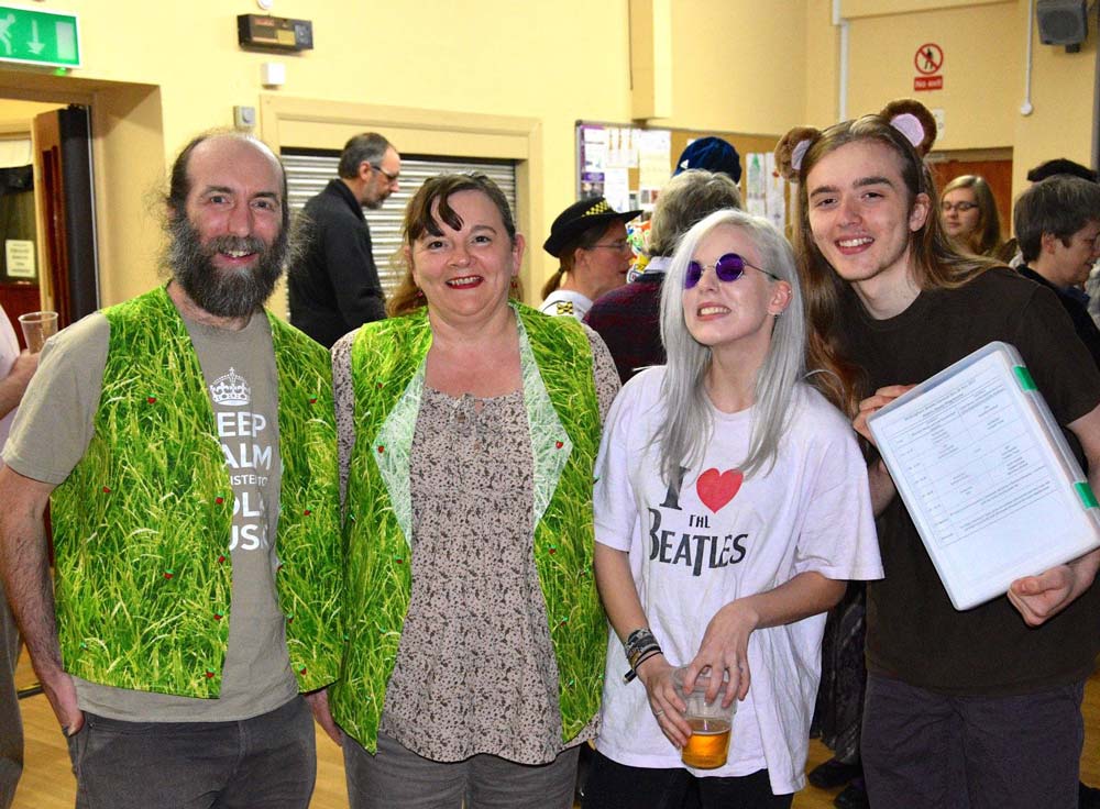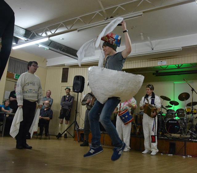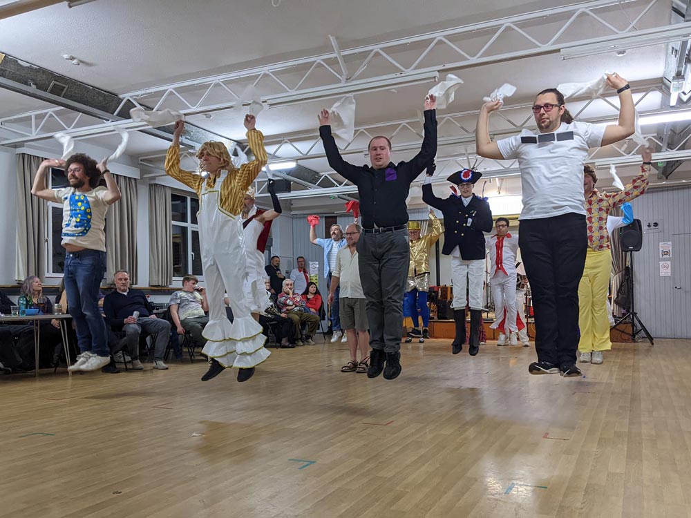 Lowlights over the years have included Flashdance, Schwarzkopf, YMCA, the famous Cockneys, Berkshire Bumfolosi, The Swans, The Men In Various Things including Black, Black and White, Tights, Coloured Ties, and Bags; The Can-Can, Flamencos, A Chorus Line, Bolshoi Bedlam, Keystone Cops, the All Star Cheerleaders, the Smurfs, Charleston Champions and Star Wars style, Austin Powers, A Hard Day’s Bunfight, the Wellerman, Me Ol’ Bamboo, and literally the lowest of all the spots : the legendary ‘Stumpton’, a spot still talked of in revered tones today, mainly due to the leapfrogs, or more accurately stumpfrogs. Covid led to the cancellation of the 2020 Bunfight and a much restricted evening in 2021, but in recent years the Bunfight is back to its weird and wonderful best, most recently in 2025 with the Diatonics again providing some specially curated music for the Ugly Bug Ball, along with ‘Mr. Marveloso’ Nick Walden as caller. All the usual Bunfight entertainments were in place including Bedlam Bingo and a Kraftwerk inspired show spot including ‘Das Hokey Cokey’, ‘Kopf, Schulter, Knie und Fuss’ and ‘Ich bin eine kliene Teekanne’. You had to be there, really – and why not be in 2026 when we’ll be doing it all over again on Sat 28th Nov 2026!